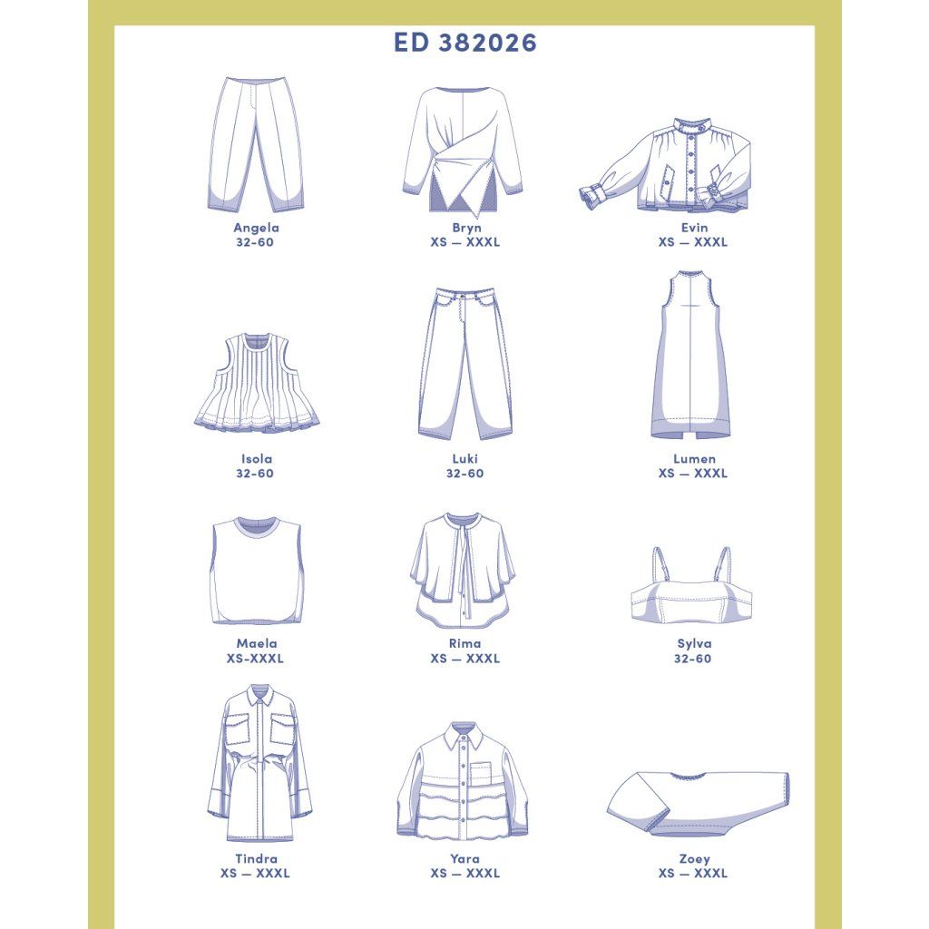 Kalhoty Angela a Luki zaujmou neobvyklým členěním, zatímco halenka Bryn a top Isola pracují s asymetrií, sklady a zajímavou stavbou oděvu. Šaty Lumen a košilové šaty Tindra působí čistě a sebejistě. U halenky Yara se pracuje s lehkostí a volánovým detailem. A bunda Evin, halenka Rima i top Zoey ukazují, že promyšlené linie nejsou domácím šičkám zapovězené a že si i ony mohou šít střihově dost zajímavé věci. Pro vrstvení a jemnější kombinace dobře fungují top Maela a podprsenka Sylva.
