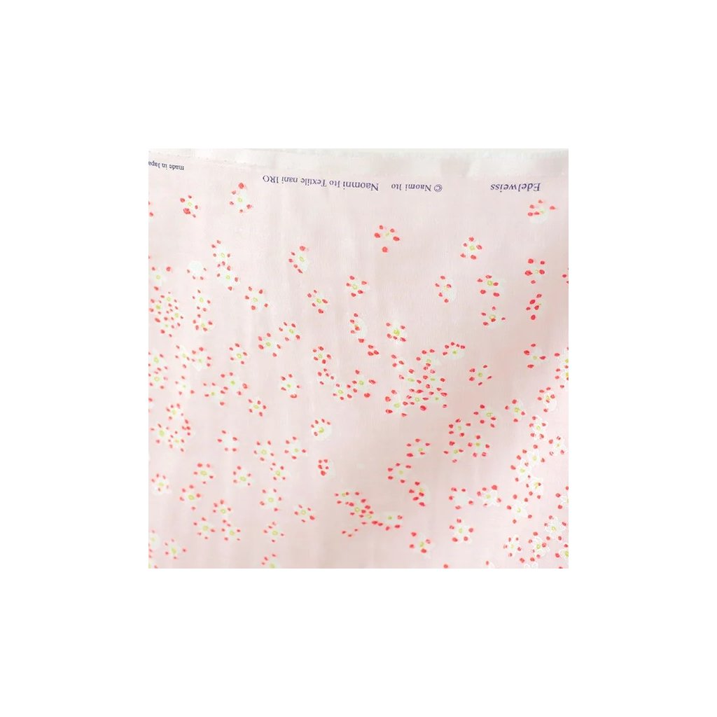 Edelweiss ve světlé růžová je novým přírůstkem z dílny japonské designérky Naomi Ito. Látka je poseta drobnými kvítky protěže alpské s červenými detaily v opakujícím se vzoru. Vzor složený s květinových rámů se opakuje po 61,5 cm.