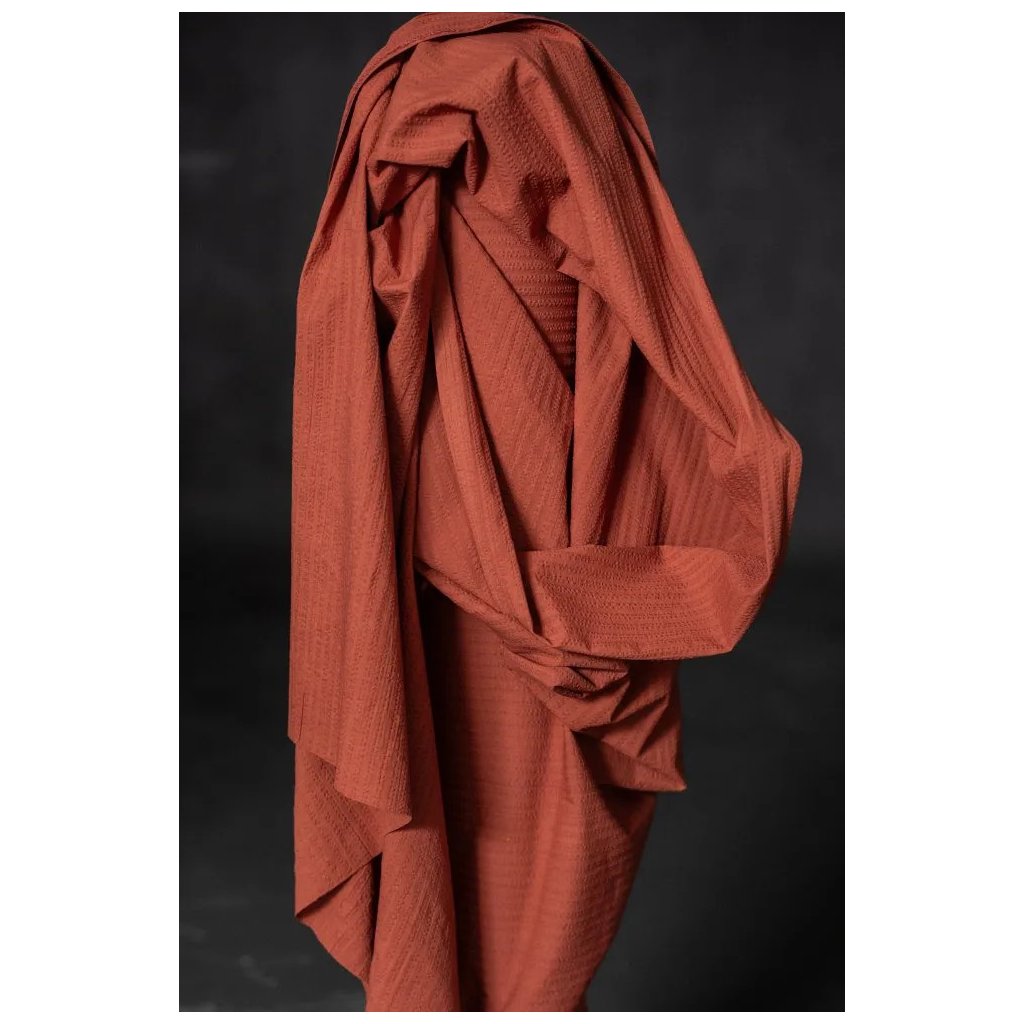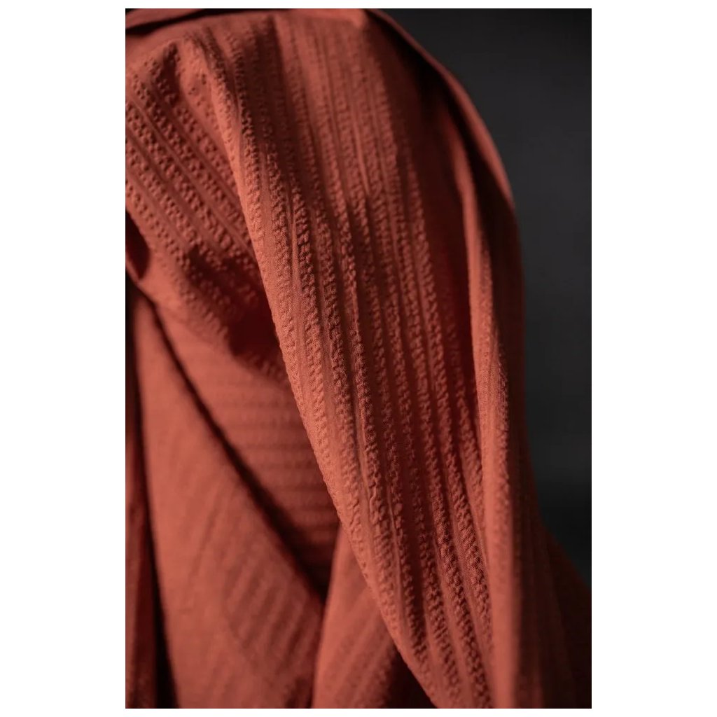 Organická proužkovaná bavlna s krepovou strukturou, tzv. seersucker, v krásném rezavém odstínu. Její barva i gramáž se budou hodit na podzimní kousky do vašeho šatníku, představujeme si košile, šaty, nařasené sukně a volné kalhoty.