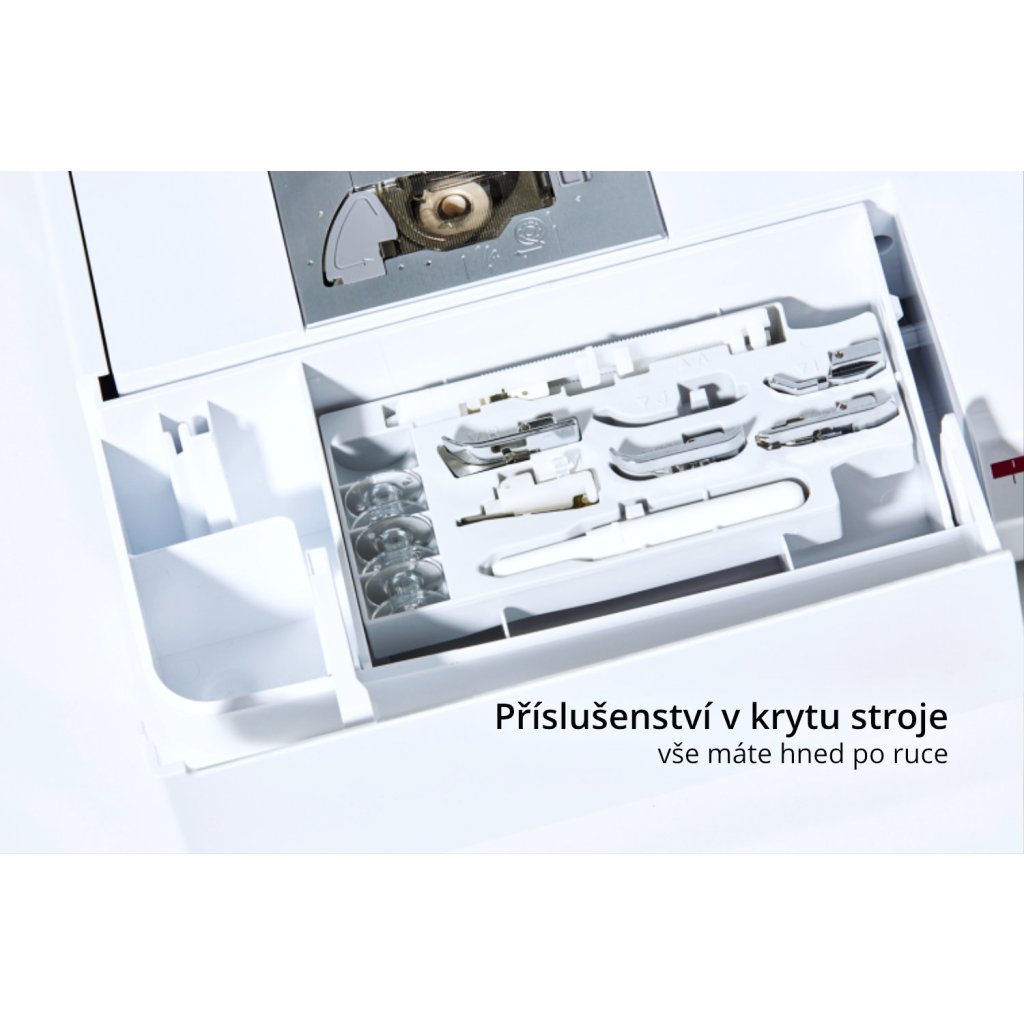 - set jehel, dvojjehla, cívky na spodní nit (4x), druhý kolík nitě, páráček, štěteček, šroubováky, síťka na nitě, krytky špulky nitě (malá, střední a velká), nožní spouštěč, kabel, český návod k použití