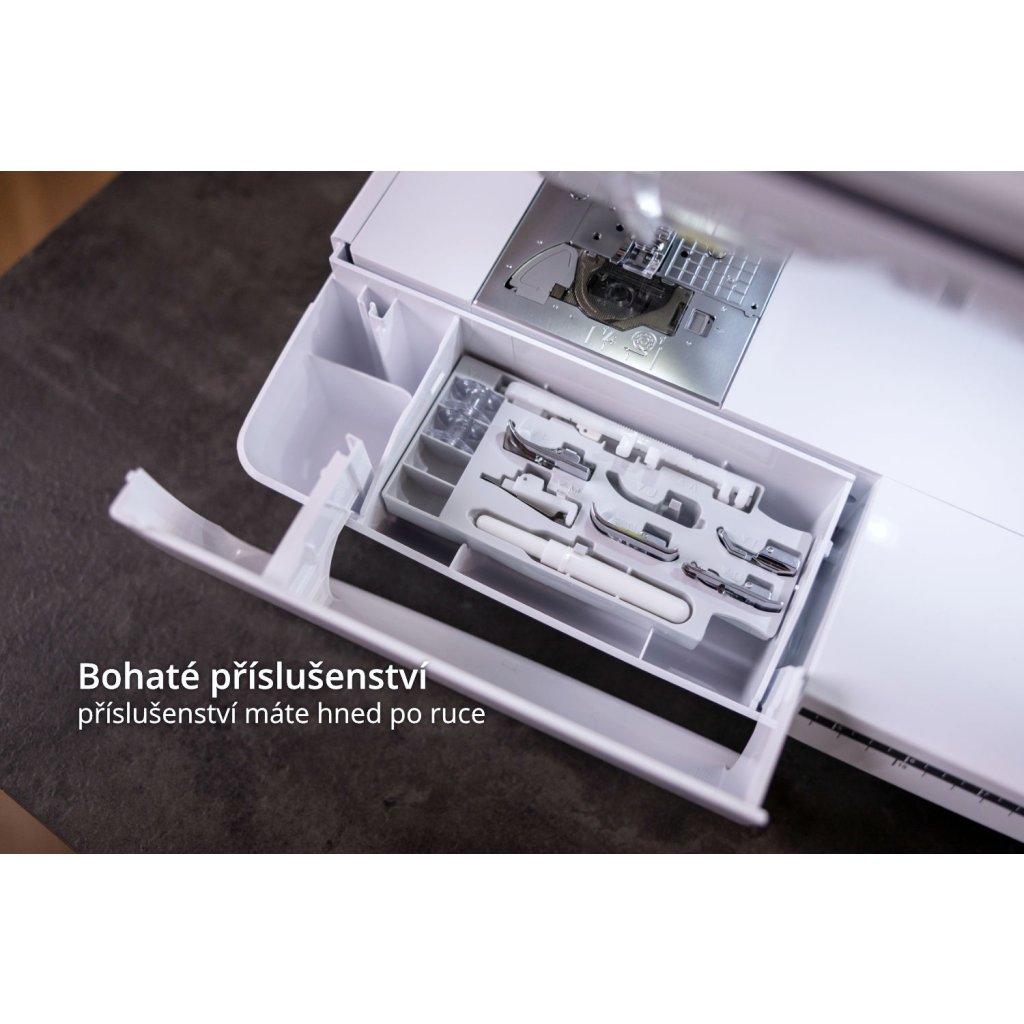 Díky velké pracovní ploše a kolenní páce bude ideálním společníkem pro patchwork i pokročilé oděvní projekty. Pohodlně na něm zvládnete ušít deku i dlouhý kabát a množství vyšívacích stehů zase uspokojí touhu po personalizaci hotového kousku například monogramem.