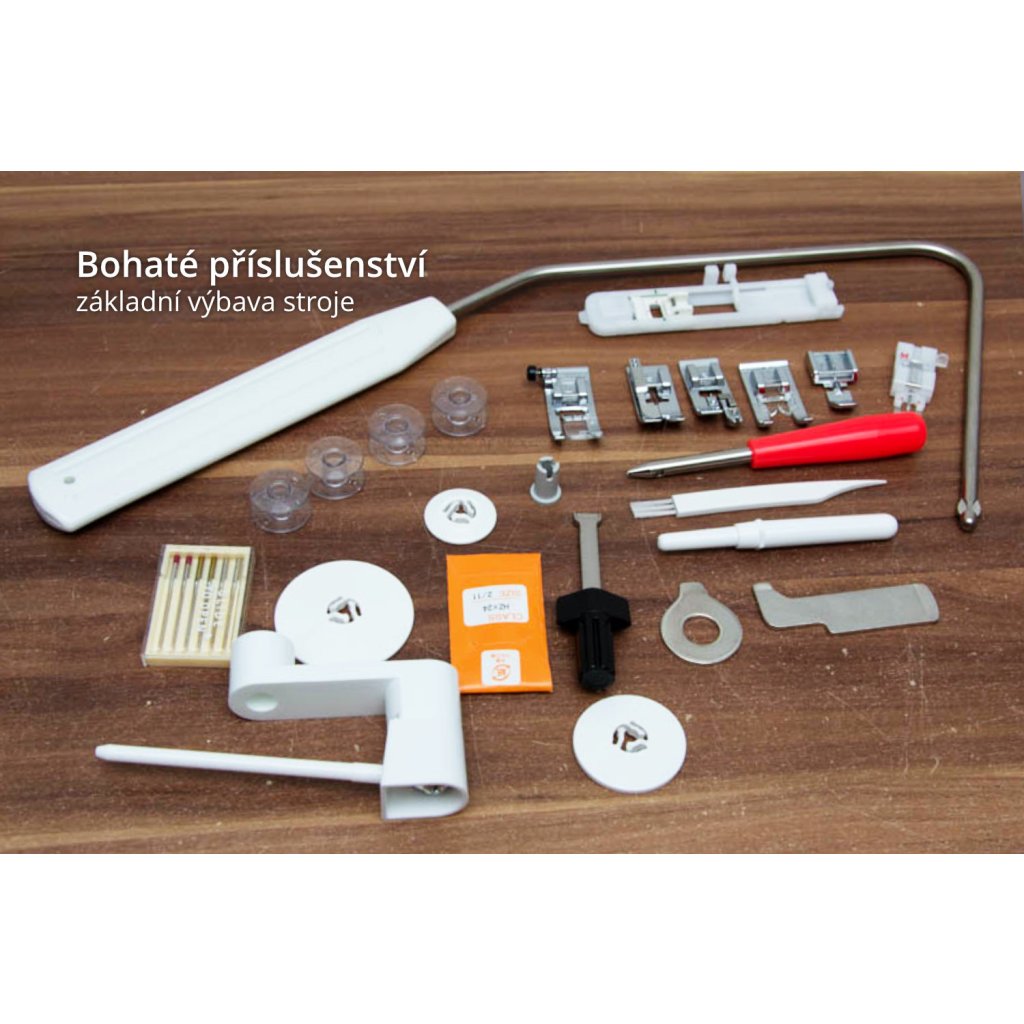 - set jehel, dvojjehla, cívky na spodní nit (4x), druhý kolík nitě, páráček, štěteček, šroubováky, síťka na nitě, krytky špulky nitě (malá, střední a velká), nožní spouštěč, kabel, český návod k použití