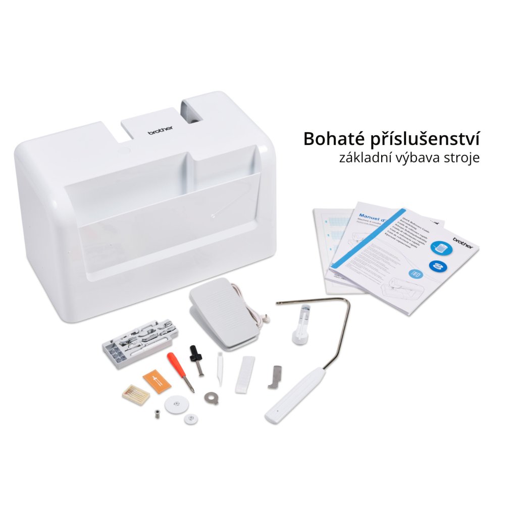 - set jehel, dvojjehla, cívky na spodní nit (4x), druhý kolík nitě, páráček, štěteček, šroubováky, síťka na nitě, krytky špulky nitě (malá, střední a velká), nožní spouštěč, kabel, český návod k použití
