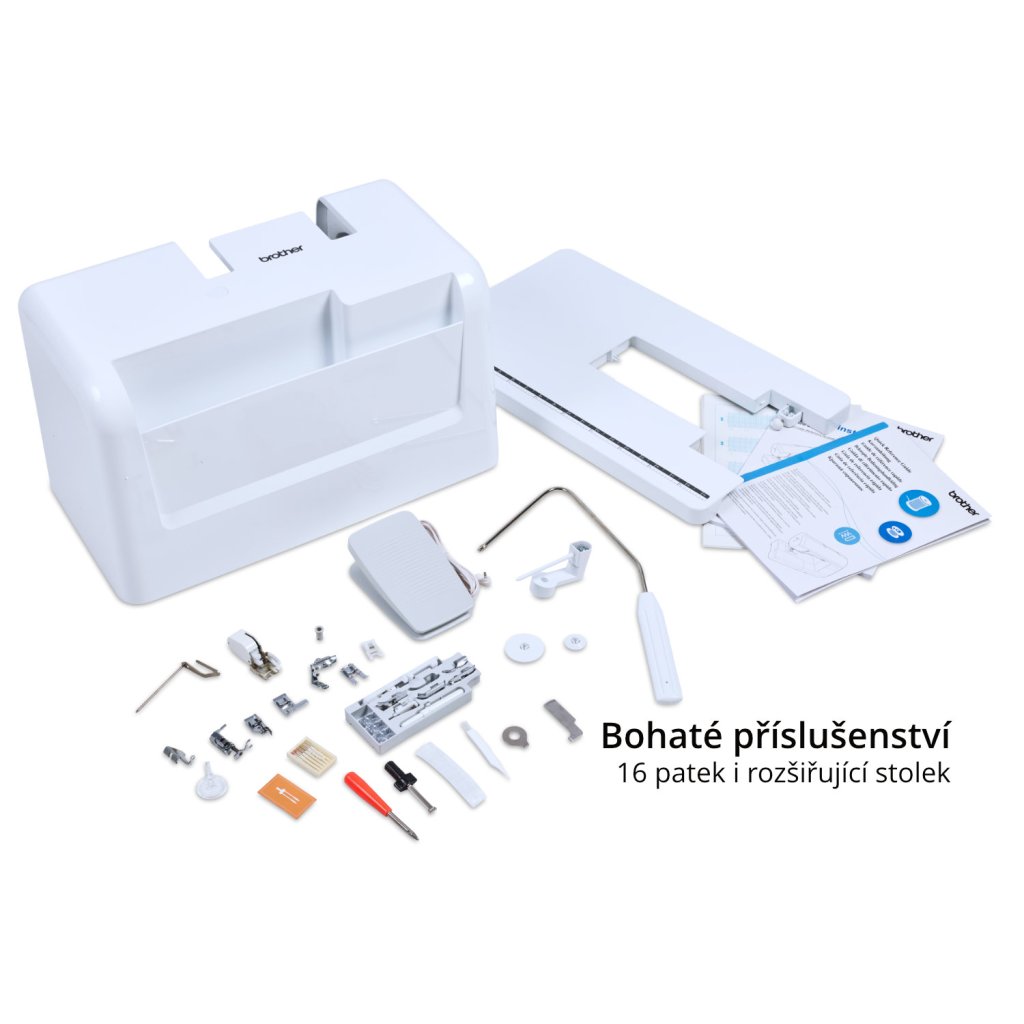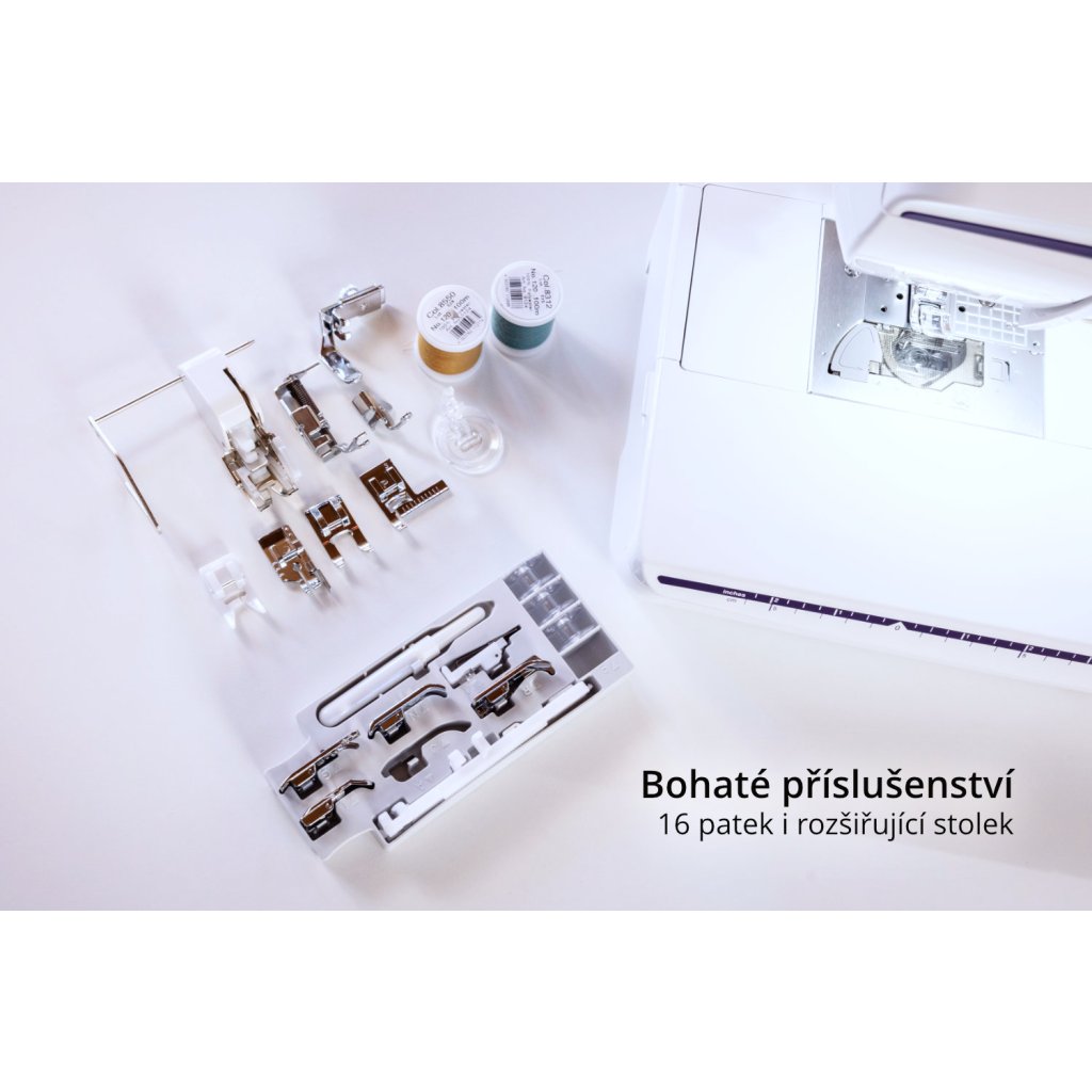 - set jehel, dvojjehla, cívky na spodní nit (10x), druhý kolík nitě, páráček, štěteček, šroubováky, síťka na nitě, krytky špulky nitě (malá, střední a velká), nožní spouštěč, kabel, český návod k použití